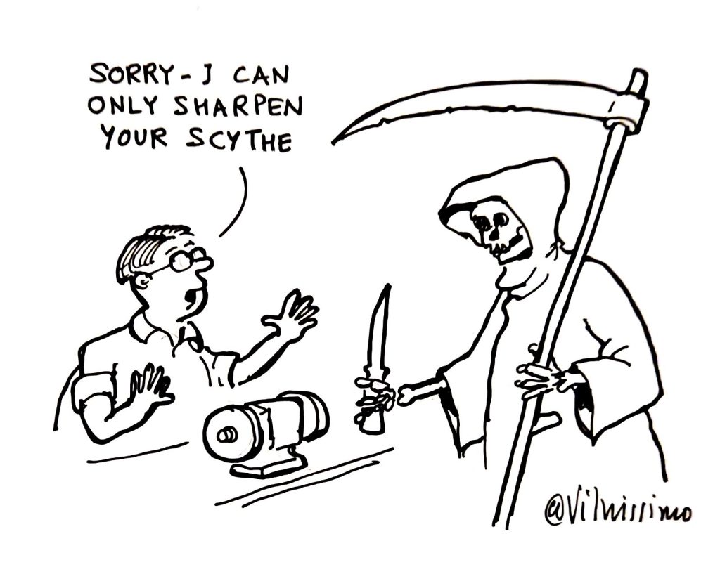 Our insurance does not cover knife sharpening at the moment because insurance companies are generally refusing to provide cover thanks to fears of knife crime. However, we can sharpen shears, secateurs, mower blades, scissors and the like, and expect to be able to do so until there is a rash of mower-blade attacks.