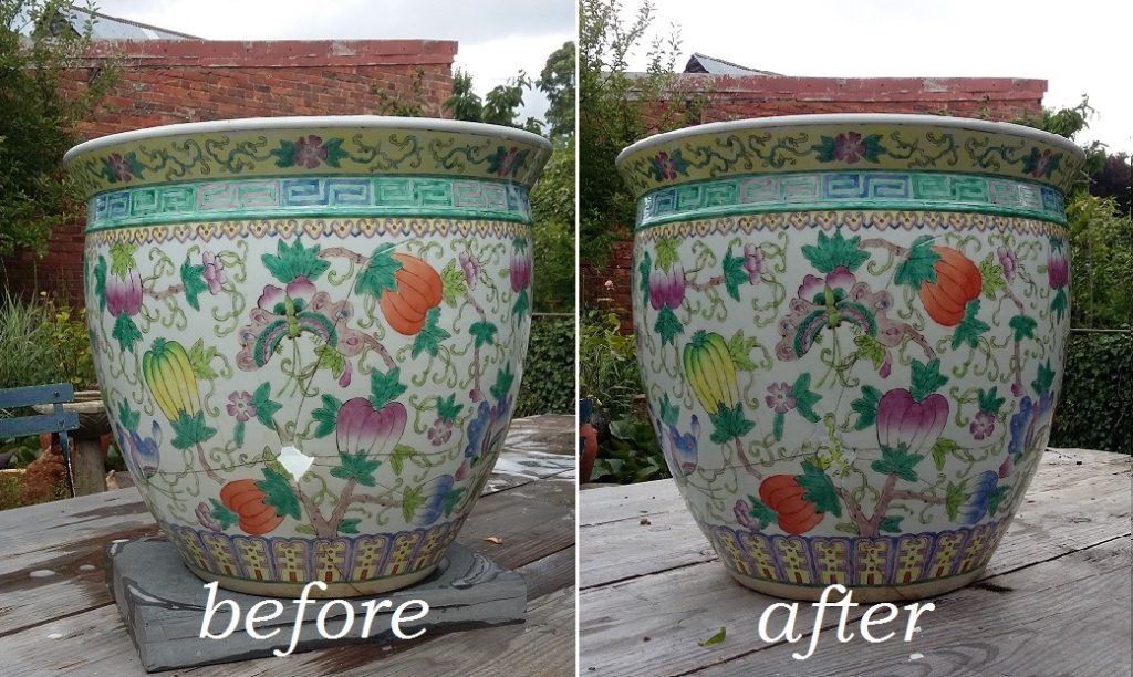 CHANNELING KIRSTEN FROM “THE REPAIR SHOP”… I have become a total fan of epoxy putty. To deal with this hole in the side of a ceramic planter I used a steel-filled putty which bonds well to concrete and glass etc. Hard enough to sand down in 20 minutes, painted with a coat of B.I.N. primer (dry in 15 minutes), pattern loosely touched in with watercolours and sealed with a coat of metal lacquer to give it a glossy finish.