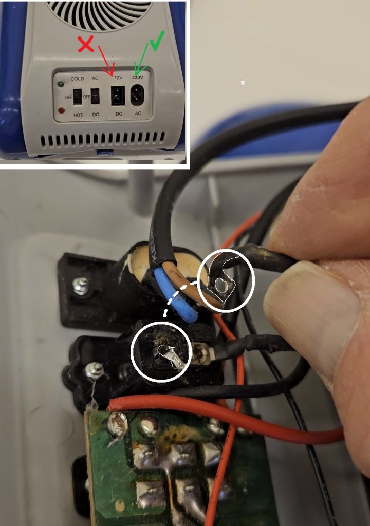 An electrical cooler box (pictured) came in, reported as working on mains power but not on 12-volt supply. The fault was simply a broken solder joint on the 12-volt connector (soon repaired). Meanwhile a wooden stool had its loose legs reconnected firmly, but both a plug and a radio were considered not repairable.